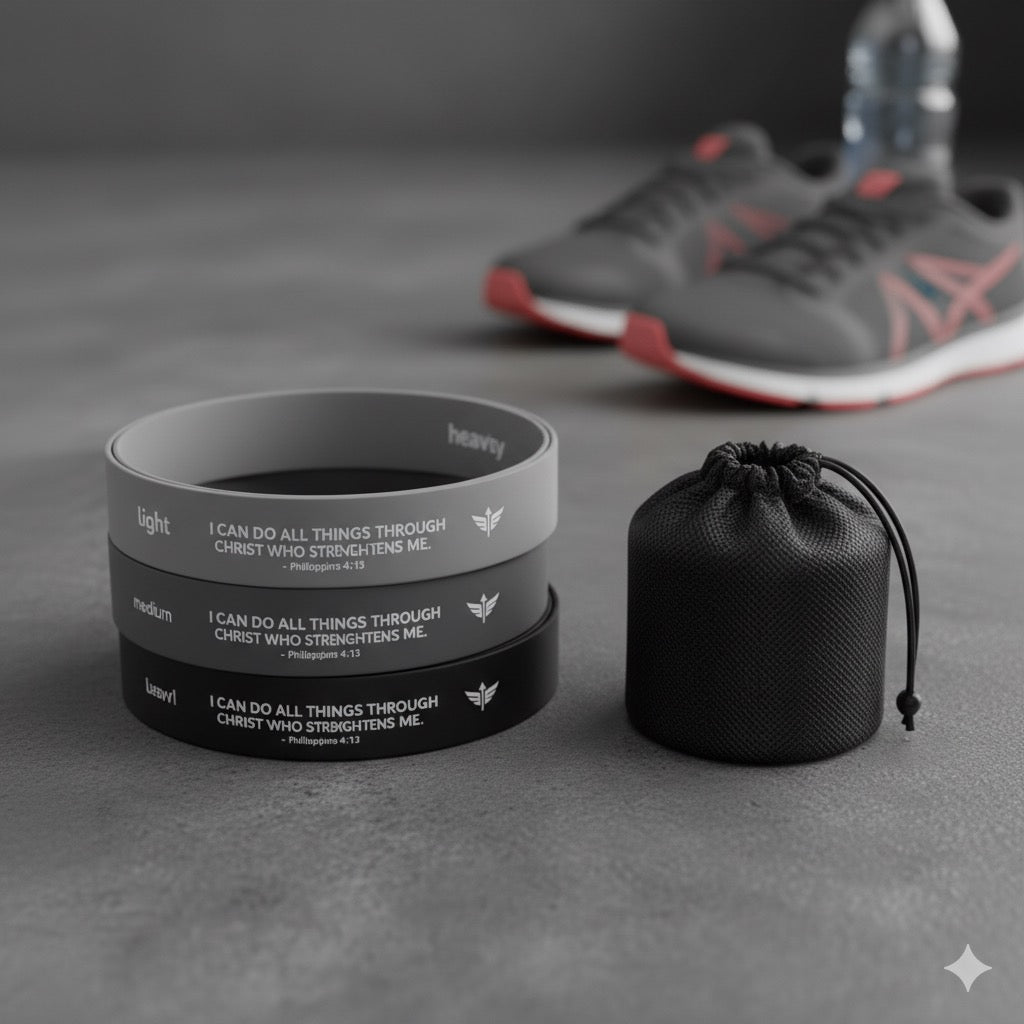 Set of 3 resistance bands for home workouts and mobility. Compact and durable. Includes carry pouch. Verse: Philippians 4:13.